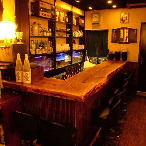 木のぬくもりが伝わるカウンター。お酒もズラリ。
