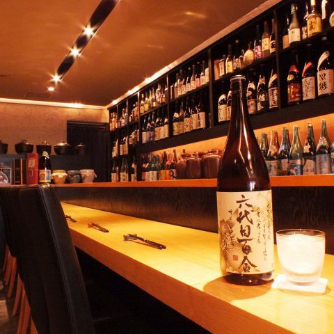 壁一面に並ぶボトルは300種類。季節ごとに焼酎も入れ替え、いつも最高のお酒が楽しめるように手を抜かないのがこちらのこだわりです。氷は丸型を使用し、長くお酒を楽しめるように配慮。料理やチェイサーも鹿児島の水を使用する徹底ぶりです。気の利いたおもてなしをお楽しみください。