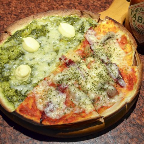 「よくばりピザ」はトマトもバジル風味も楽しめてお得感あり。