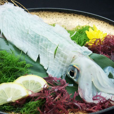 築地直送の生け簀だから、透きとおったイカをそのまま食べられます!