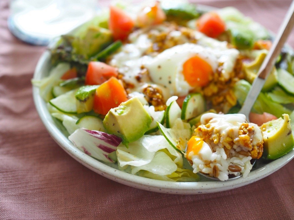 6. 切っておいた野菜を散らし、温泉卵をのせ、ブラックペッパーをふって完成。