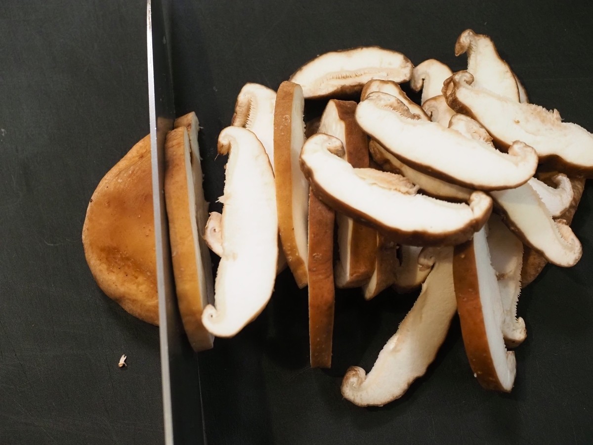 軸は石突きを切り落として、できるだけ薄く輪切りにして入れます。