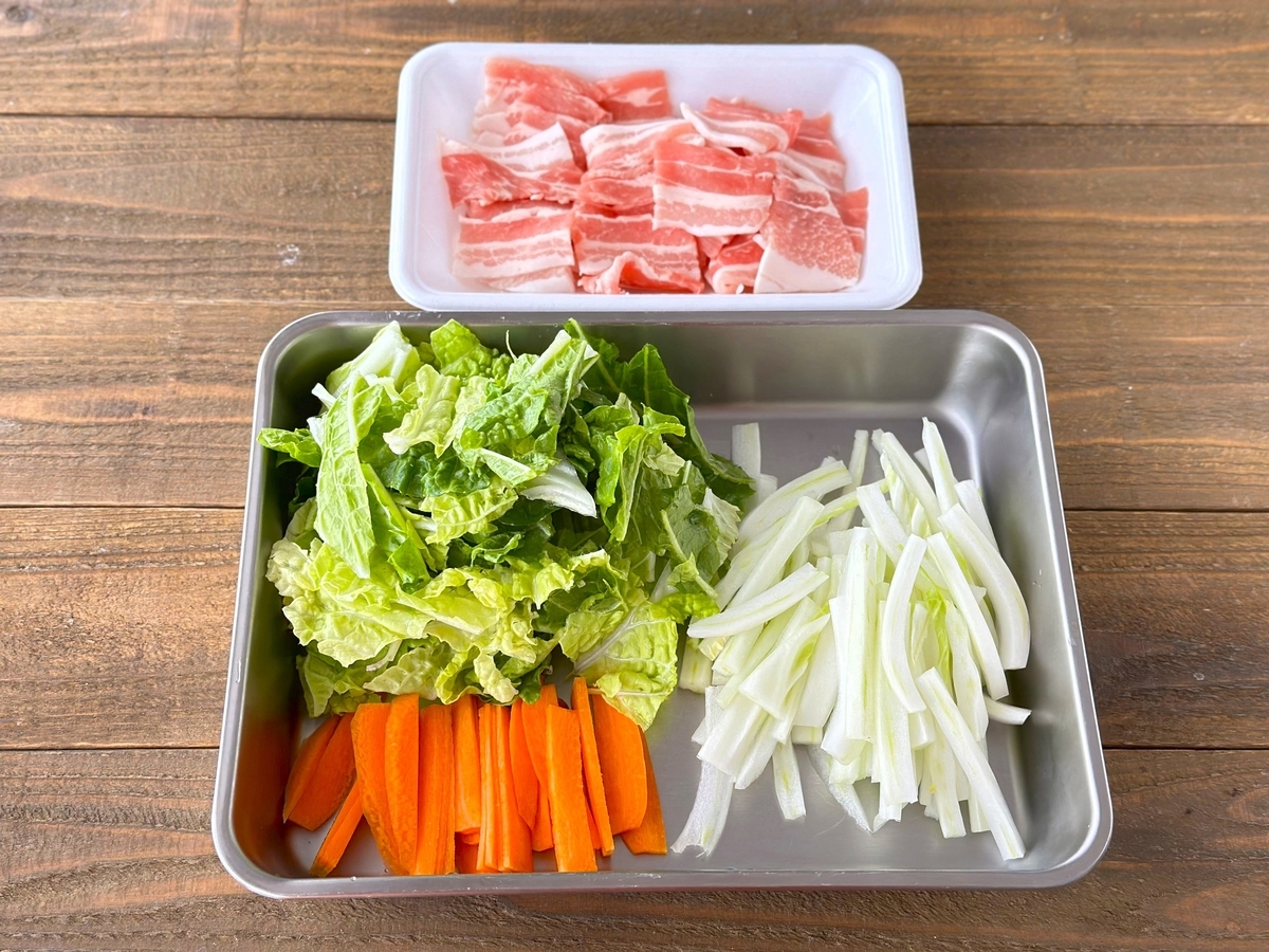 1. 豚バラ肉は食べやすい長さに切る。白菜は葉と芯に分け、葉は手で食べやすい大きさにちぎり、芯は細切りにする。にんじんは幅1cm程度、厚さ1~2mmの短冊切りにする。(A)は混ぜ合わせておく。