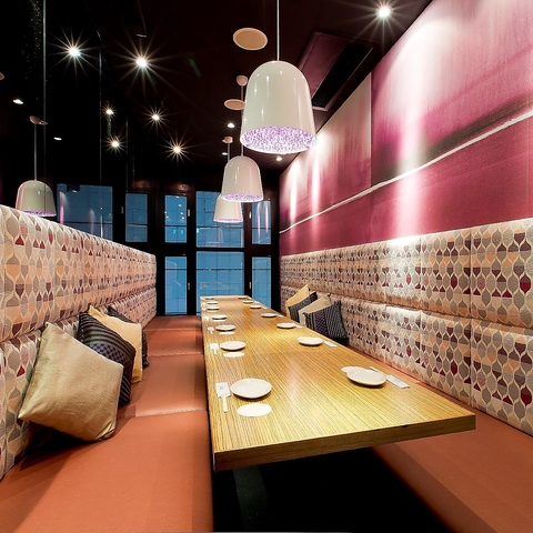 大人数での宴会も個室でゆっくり楽しめます。座席は座りやすく、足を伸ばしてゆったりくつろげるお席を完備!洗練されたデザインの個室で、ゆったりとしたひと時をお過ごしください。