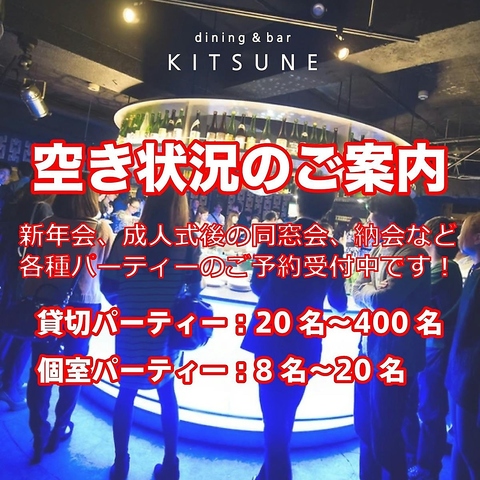2026年の新年会、同窓会もKITSUNEで決まり!20~400名様まで貸切可能でございます。まだ空いている日もございますのでお気軽にお問い合わせください♪まったりとお話するのもワイワイ盛り上がるのも使い方はお客様次第!お洒落な空間をお楽しみください♪