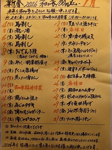 【2026年1月の100円料理】◎おかわり何度でもどうぞ※天候・仕入状況・品切れ等により、内容が一部変更となる場合がございます。※毎週金曜日の100円の品売上金は義援金とさせていただいております。本年も和が家をよろしくお願い申し上げます。