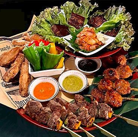 和ジアの美味しいところを盛り込んだ肉盛りです!!!鶏つくね串、ラム串、スペアリブ、肉みそピーマン、手羽唐ポテト2種のディップでお召し上がりください。※ご注文は2人前からになります。