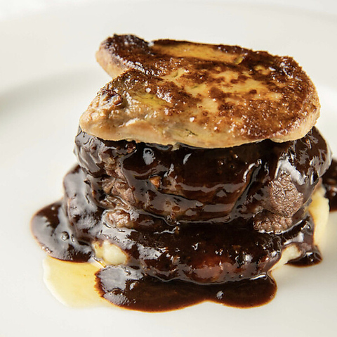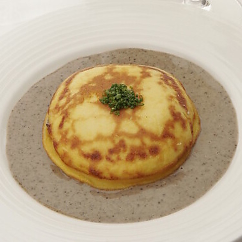甘みのあるパンケーキと香ばしく焼いたフォアグラにシェリービネガーとトリュフソースの絶妙かつ濃厚なソースで合わせた一度食べたら病み付きになる一品です。