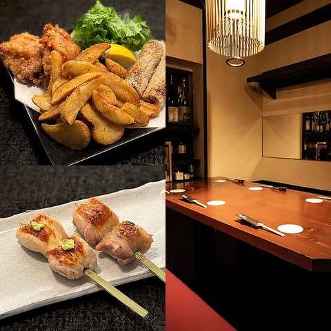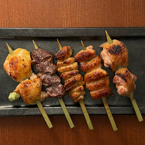 銘柄鶏の焼鶏を上質な馬目樫の紀州備長炭を使い、組み方にこだわり極めて近火の強火で一本一本ジューシーに焼き上げています。大ぶりな身で打つ串は『目で見て衝撃、食して感動』。定番から希少部位まで、種類豊富にご用意しております。