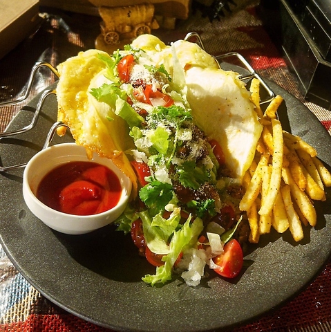タコスに天使の羽のようなチーズが覆う一品。女性から大人の男性まで、病みつきになると大好評のブーメランスペシャリテ