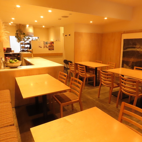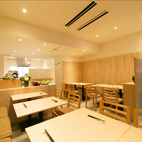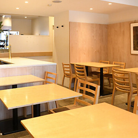 白木調の明るい店内は、どなた様でもごゆっくりとお食事をお楽しみいただける心地よい雰囲気です。2名様用のテーブルを多数ご用意しておりますので、机をつなげて大人数でのご利用も可能です。また、14名様以上での貸切も承っております。