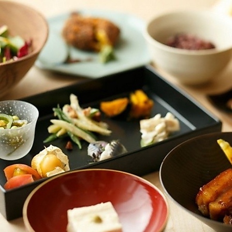 新鮮な旬の採れたて野菜を、一つずつ丁寧におばんざいとして仕上げました。「体にやさしい」をコンセプトにした人気のメニューには、山梨や千葉、熊本からの厳選された野菜を使用しており、身近にある素材を生かしつつ、おいしく安心してお召し上がりいただけるお料理をご用意しております。