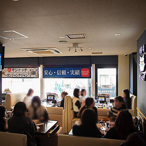 大型ガラス窓から大久保通りが見渡せる清潔感ある店内