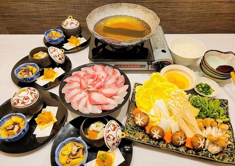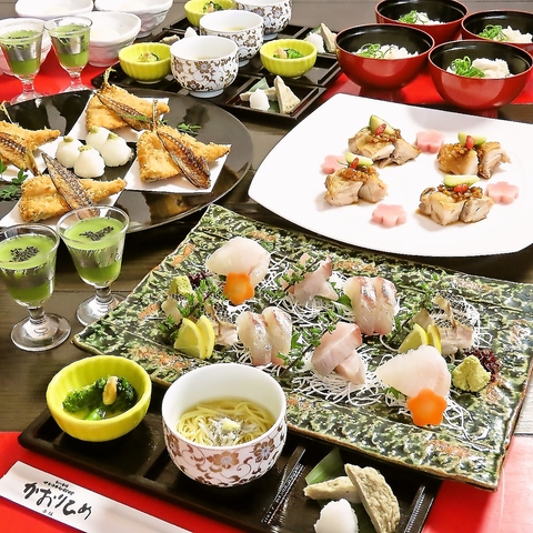 新鮮な旬のお刺身はもちろん、地海老の唐揚げなど、瀬戸内海で獲れた地魚と丸亀市名物骨付き鶏や小豆島産の鱧などをたっぷり使った香川県郷土料理をラインアップ。オリーブそうめんを使った前菜や讃岐白天も付いています。〆はやっぱり讃岐うどん!香川の味覚をご堪能ください。