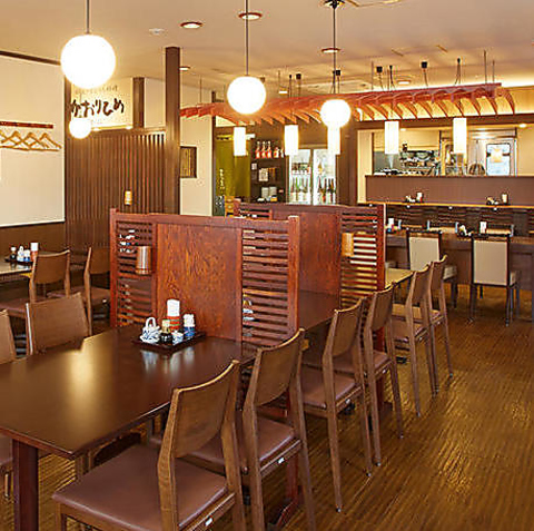 解放感のある店内はお席の間隔が広々としております。ベビーカーでお越しの際でもご安心してご利用頂けます。