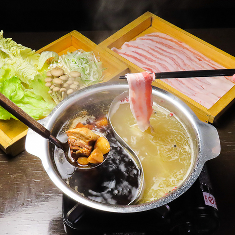 醤油麻辣の旨辛スープで煮込んだ特製ニンニク角煮鍋と、生姜の香りが広がるまろやか豚レタスしゃぶしゃぶを同時に味わえる二色鍋。食欲を刺激する濃厚なコクと、体を内側から温める優しい味わいが楽しめる、満足度抜群の自慢の逸品です。