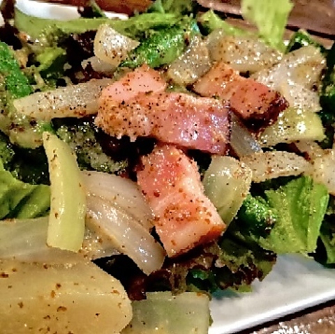 リエージュ地方の家庭料理。 マスタードソースと温かい素材にビールが進みます! ツマミになるサラダ。
