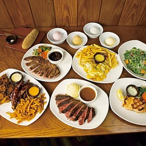 看板メニューを手軽に楽しめる全8品のプランです。2時間飲み放題が付いてお一人様6500円(税込)と、団体様も利用しやすい価格設定が魅力◎リブアイステーキやベビーバックリブを囲んで、賑やかなパーティを演出できます。大人数でもゆったり座れる広々としたお席で、本格ステーキハウスの活気を存分にご堪能ください♪