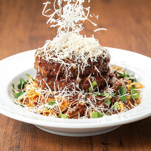 ≪ハンバーグボロネーゼW(ダブル)≫牛100%のハンバーグのダブルにイタリア産削りたてチーズのトッピング。その他にも多数のトッピングをご用意!自分好みのイタリアンを見つけてください。