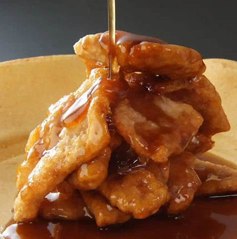 表面をサクっと揚げた豚肉に、黒酢風味のとろりとしたコクあるソース。肉の質とソースで勝負した逸品。