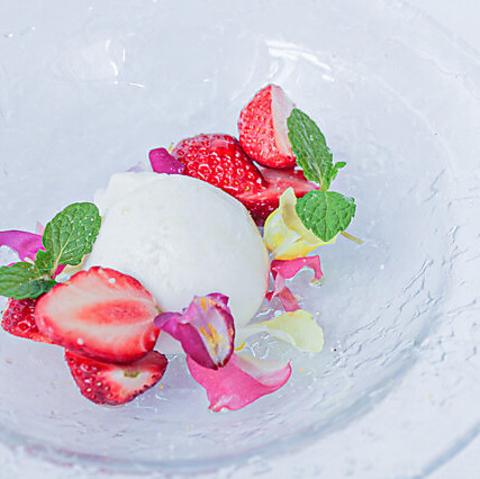 ブッラータチーズと旬のフルーツを合わせました。中からとろけるチーズ。