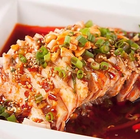 柔らかく蒸しあげた鶏肉に、花椒や唐辛子が効いたピリ辛タレが絡み、口に入れた瞬間に香りと旨味が広がる絶品前菜。ごまのコクと醤油の深みがアクセントとなり、一口ごとに箸が止まらない美味しさ。冷菜としても温菜としても楽しめ、さっぱりしつつも後引く辛さで、お酒にもご飯にもぴったり。シンプルながら職人技が光る、まさに中華の定番かつ贅沢な一皿。