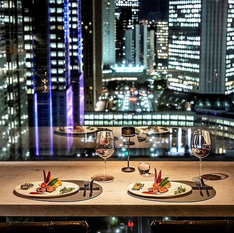 西新宿の高層ビルが目の前に広がる異空間は、まるで空中に浮いているような感覚に。店内は落ち着いた間接照明で、ワンランク上の上質な雰囲気でお過ごしいただけます。