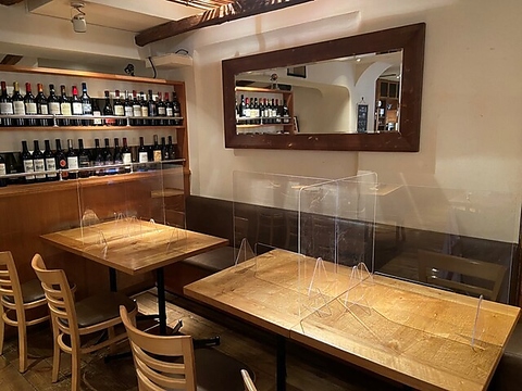 広々としたテーブル席は、最大9名様までご利用いただけます。窓際に配置されたゆったりとしたソファシートは、長時間の滞在でも快適にお過ごしいただけます。ご友人やご家族との賑やかなお食事に最適です♪ ワインボトルが並ぶお洒落な空間で、心ゆくまでお楽しみください。