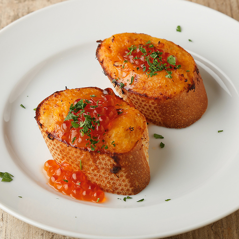 ズワイガニを使った濃厚なクリームをバケットにのせ、いくらで華やかに仕上げた一品。