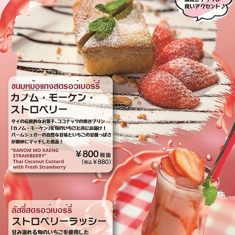 カノム・モーケン・ストロベリータイの伝統的なお菓子、ココナッツの焼きプリン「カノム・モーケン」を旬のいちごと共にお届け!パームシュガーの自然な甘みといちごの甘酸っぱさが絶妙にマッチした逸品!Thai Coconuts Custard with Fresh Strawberry