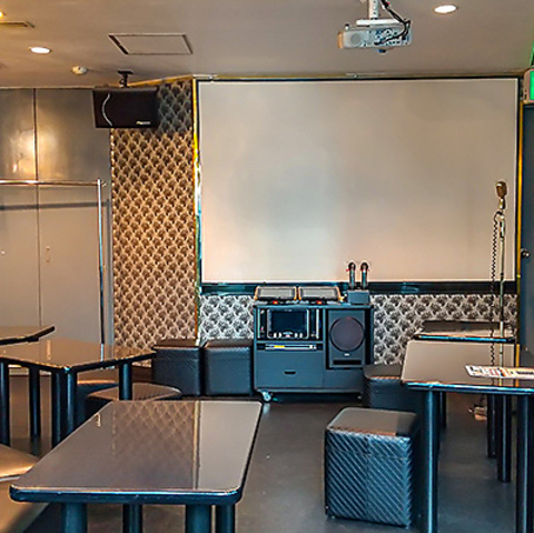 迫力満点の二面プロジェクタールームになります。本人出演などの映像重視の方はぜひこちらのルームをご体験ください。こちらのお部屋は人気が高いため、店舗までお電話にてご予約くださいますようお願い申し上げます。ご予約の際は、「デュアルモニタールーム希望」をお申し付けください。