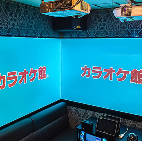 迫力満点の二面プロジェクタールームになります。本人出演などの映像重視の方はぜひこちらのルームをご体験ください。こちらのお部屋は人気が高いため、店舗までお電話にてご予約くださいますようお願い申し上げます。ご予約の際は、「デュアルモニタールーム希望」をお申し付けください。