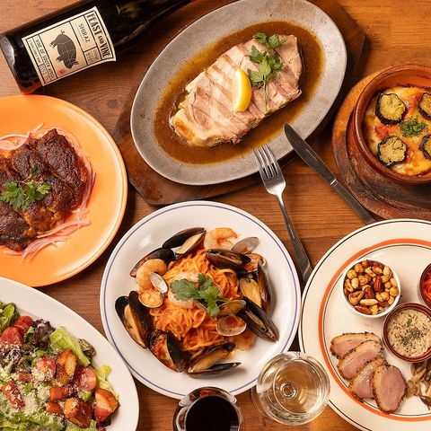 ◆クーポン利用で3時間飲み放題に変更可能◆前菜にはアンティパスト5種盛り合わせを。メインディッシュは2種。しっとりジューシーに焼き上げた「豚肩ロースのステーキ」。続いて、スパイシーな下味をしっかりまとわせて香ばしくグリルした「スパイシーチキングリル」で、肉の旨みとスパイスの刺激をご堪能ください。パスタには香り高いポルチーニ茸のクリームパスタを。