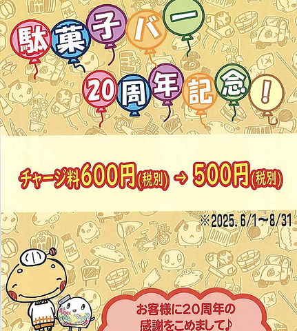 駄菓子バー20周年を祝いまして、チャージ料500円(税込550円)!!