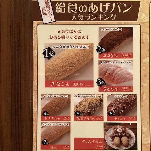 みんな大好き!あげぱんなど、大人になった今はなかなか食べられない給食メニューが楽しめます!あげぱんの味はアイスあげぱん含めて計8種☆