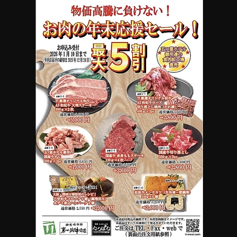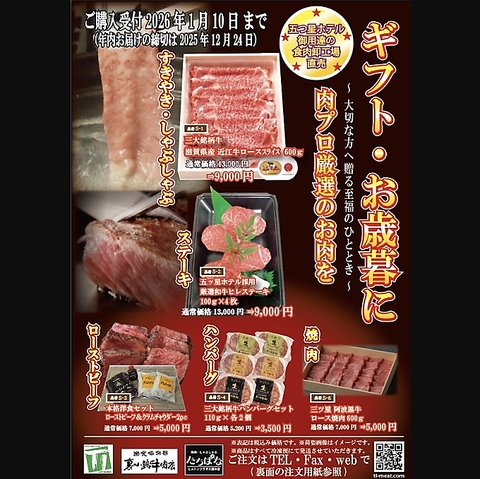 近江牛スライスやホテル採用の厳選ステーキ、ハンバーグ、ローストビーフなどのギフト向け商品に加え、五つ星ホテル採用の高品質肉を含む焼肉・すき焼き・ステーキ用まで年末限定価格でご提供。数量限定の逸品が揃い、贈答用にも冬の食卓にも最適です。