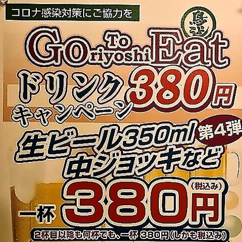 【第4弾!】GO TORIYOSHI EAT!ドリンク380円キャンペーン!2杯目以降も1杯380円税込み!!
