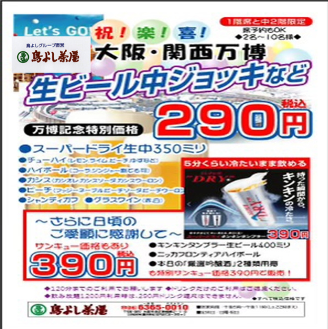 万博記念特別価格!生ビール中ジョッキなど290円!
