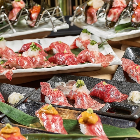みつるが自信を持ってご提供する鮮度抜群の肉寿司たち。贅沢に黒毛和牛を炙り肉寿司でお召し上がりください♪中でも肉炙り寿司三種盛りは、三種の味を食べ比べて価格もお得に。満足していただける納得のひと皿です。手巻き肉寿司では、いくらやかに、ホタテもご堪能いただけます◎