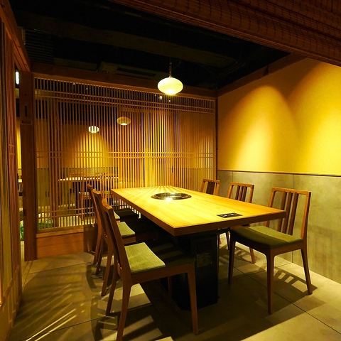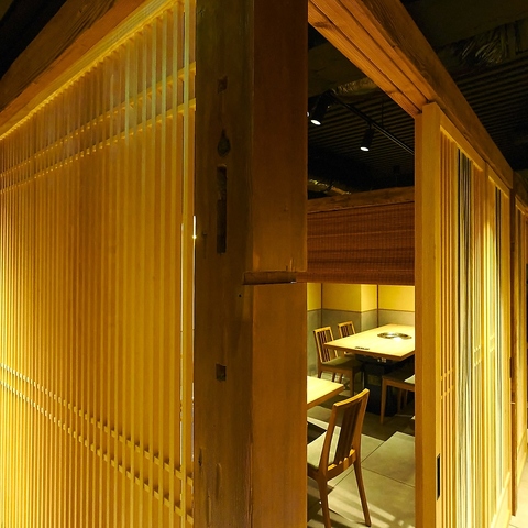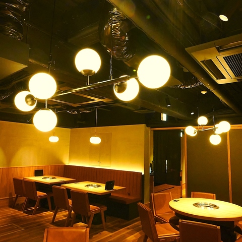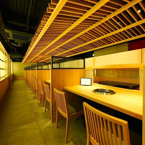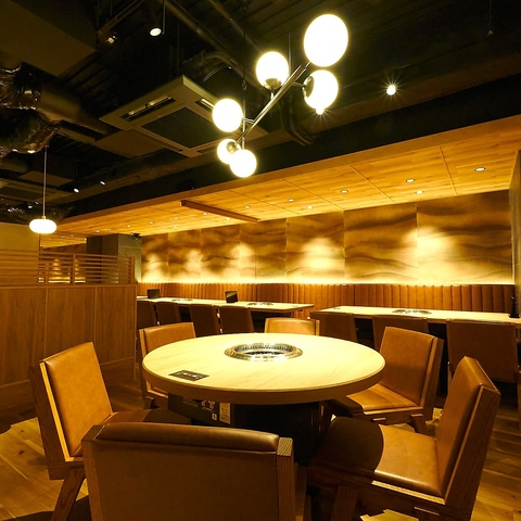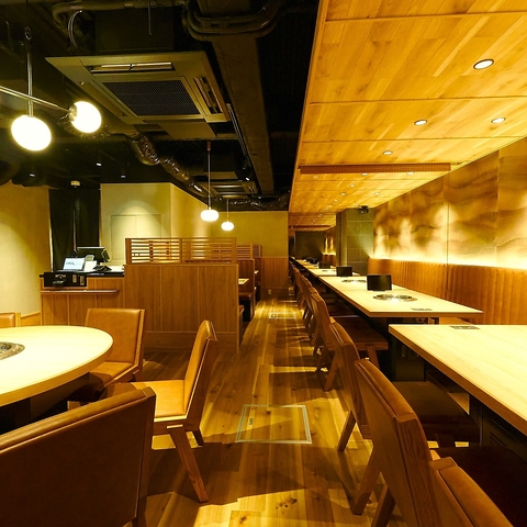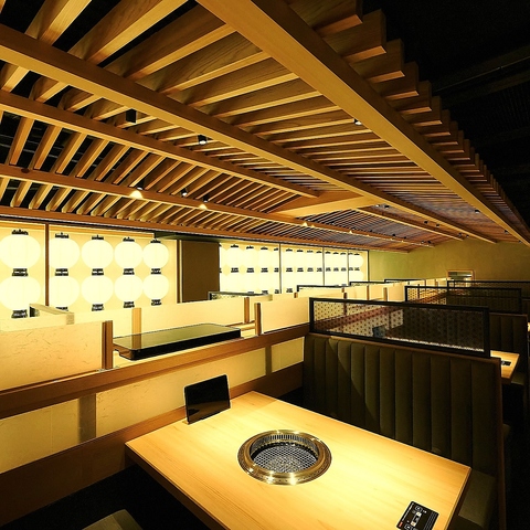 【2F 最新設備導入! 】木のぬくもりを感じる和風のインテリアが特徴です。落ち着いたトーンの色合いとシンプルなデザインのテーブルや椅子が配置され、居心地の良い空間を演出しています。柔らかい照明が心地よい雰囲気を作り出し、友人や家族との食事に最適です。店内にはお肉がレーンにのって届けられる最新設備も導入!
