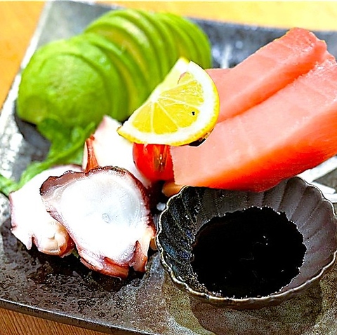 梅田本店では、アボカド、まぐろ、たこのお刺身盛り合わせをお出ししております。