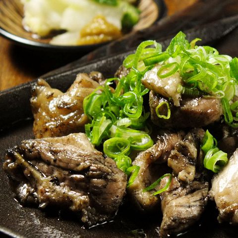 鮮度抜群のおや鶏をレアに炙ります。歯ごたえ抜群の鶏からしたたる脂と柚子胡椒を混ぜながらお召し上がりください。