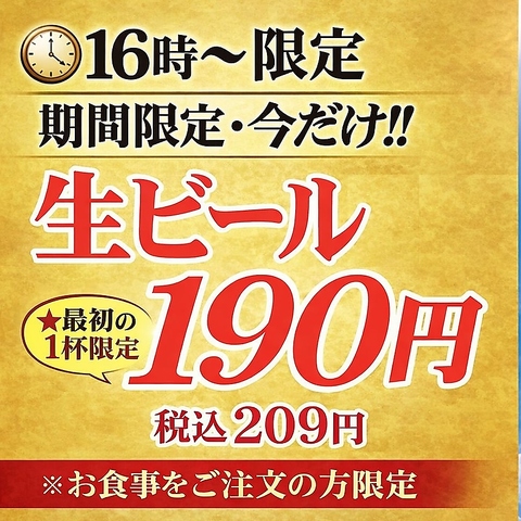 ディナー帯限定。サントリー生ビールが最初の1杯190円(税込209円) ビール片手に焼肉を満喫してください