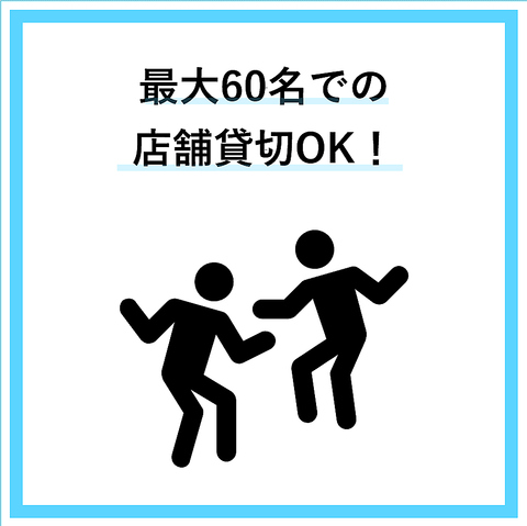 最大60名様まで入れる広々とした店内は、テーブル席のレイアウトを自由に変更することできます◎大人数での楽しい宴会などにぴったり◎貸切利用にもご対応いたします。各種宴会・歓送迎会・記念日のパーティーなどなど、様々なシーンに合わせてお使いください♪幹事様からのご相談もお待ちしております。