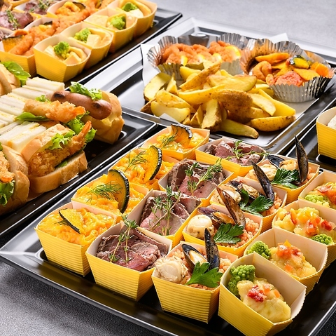 蝦夷鮑・イトヨリマスタードマリネ・シュリンプとキャロットラペ・スモークサーモンと生ハムマリネ・テリーヌとパテドカンパーニュ・丁寧な下仕込みビーフシチュー・低温で焼き上げたローストビーフ・グリエールチーズのキッシュ・10品を8枡に・3~4人用はオマール海老・牡蠣のリゾット・チキンロール3色巻・ラタトゥイユ