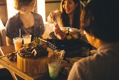 豚モモ肉/豚バラ肉/牛カルビ/鶏モモ肉/テッチャン/マルチョウなどの6種類のお肉と新鮮野菜を山のように盛ったメイン「マウンテンBBQプレート」。プルコギ風の甘辛いタレで食欲もそそられます! 野菜具材例>キャベツ/もやし/カボチャ/ジャガイモ/サツマイモ/レンコンなど