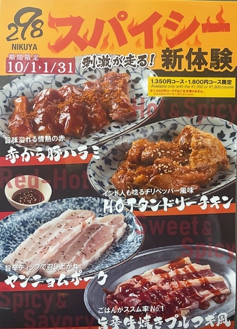 1月末まで「赤から豚ハラミ」「HOTタンドリーチキン」「ヤンニョムポーク」「旨辛牛焼きプルコギ風」