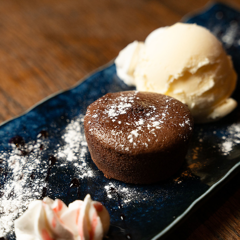 食後やラストオーダーに人気のフォンダンショコラ。添えてあるバニラアイスと一緒に食べると格別です。ぜひ一度ご賞味下さい!