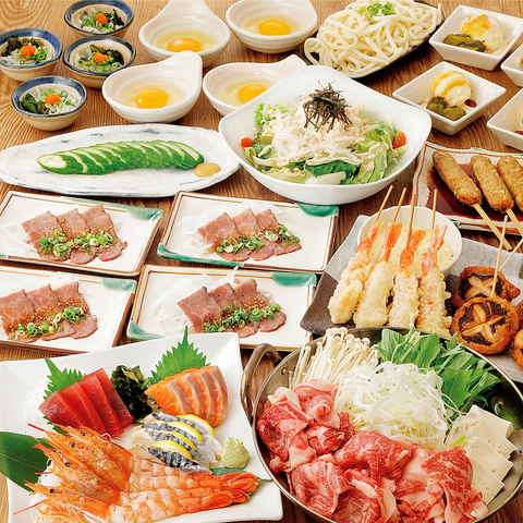 メイン鍋は、「北海道産さくらビーフすき焼き」「国産牛もつ鍋」から選択可能です。さらに、とちぎ霧降高原牛のローストビーフや刺身4種盛り合わせ、えび天串など、豪華な逸品が揃った贅沢コース。特別な飲み会にぴったりです♪
