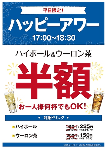 平日限定で、対象ドリンクが18時半まで半額です!!